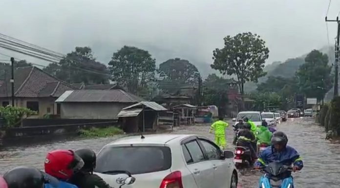 Hujan lebat mengakibatkan banjir cukup tinggi di depan...
