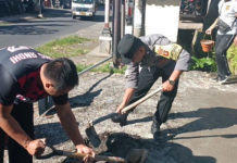 Polisi dan Warga Gotong Royong Perbaiki Jalan Rusak di Desa Tohpati