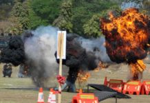 DENPASAR, BALIPOST.com - Polda Bali menggelar latihan Sistem Pengamanan Kota (Sispamkota) di Lapangan Puputan Margerana, Denpasar, Kamis (22/8). Dalam simulasi itu ditampilkan berbagai langkah...
