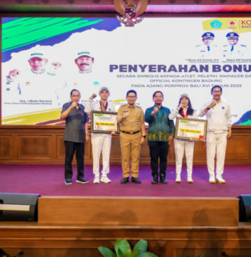 GIANYAR, BALIPOST.com - Bupati Gianyar, Made Mahayastra, di sela acara penyerahan bonus Porprov di Taman Maheswara halaman belakang Kantor Bupati Gianyar, Jumat (24/10) menyampaikan...
