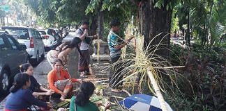 Hujan-hujan, Pegawai Pemkot Tetap Semangat Buat Penjor HUT