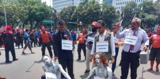 Buruh Gelar Aksi Teatrikal Manusia Silver di Bundaran Patung Kuda