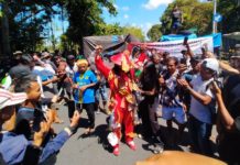 Aksi diisi dengan teatrikal sebagai bentuk sindiran kepada para penguasa yang acap kali membungkam suara rakyat yang lantang menyuarakan aspirasinya. (Ketut Winata/balipost)