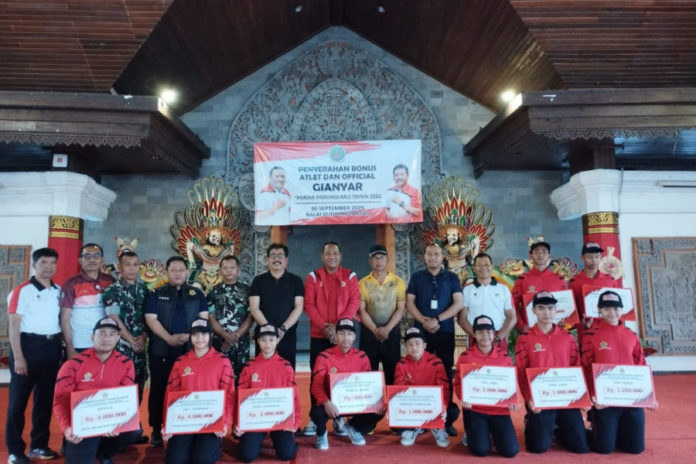GIANYAR, BALIPOST.com – Wakil Bupati Gianyar Anak Agung Gde Mayun menyerahkan bonus kepada Kontingen Gianyar peraih medali dalam ajang Pekan Olahraga Pelajar (Porjar) Provinsi Bali Tahun 2025, Selasa (30/9), di Balai Budaya Gianyar.