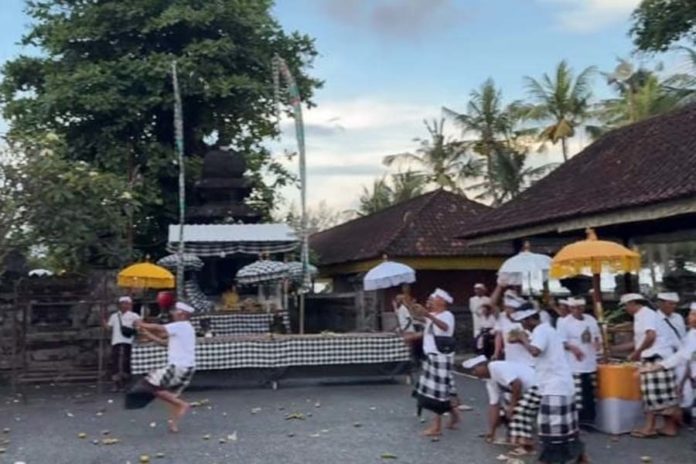 GIANYAR, BALIPOST.com – Ratusan warga, pemilik maupun penggarap lahan pertanian, yang ada dalam Pasikian Subak Pengempon dan Pengemong Pura Kahyangan Jagat Masceti, yang berasal dari Desa Adat Medahan, Desa Adat Keramas, Desa Adat Cucukan dan Desa Adat Tedung, Kabupaten Gianyar, menggelar prosesi aci ngusaba tipat (Ketipat) dan aci kalecan (tabuh rah). Tradisi yang diselenggarakan setiap 420 hari sekali ini, dipenuhi nuansa magis dan ritual.