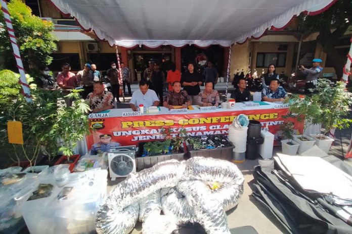 Ditresnarkoba Polda Bali menggelar barang bukti narkoba jenis ganja di Mako Polda Bali, Jumat (3/10). Tanaman ganja tersebut ditemukan di salah satu rumah di wilayah Ubung Kaja, Denpasar. (BP/eka)