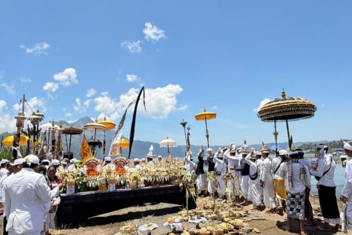 BANGLI, BALIPOST.com – Serangkaian karya Ngusaba Kapat di Pura Hulundanu Batur, Desa Songan, Kecamatan Kintamani, Kabupaten Bangli, krama adat setempat menggelar upacara malasti di kawasan Pengalangan, tepi Danau Batur, Jumat (3/10). Prosesi malasti dimulai dari Pura Hulundanu Batur dengan membawa simbol-simbol sakral menuju Danau Batur, yang dianggap sebagai stana suci Dewi Danu.