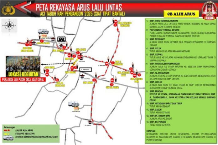 Sedangkan dari Simpang Pasar Tegeh ke selatan ditutup. Karena jalan tersebut menuju lokasi upacara. “Untuk kendaraan truk roda enam atau lebih untuk sementara selama pelaksanaan kegiatan tersebut diarahkan parkir di Terminal Mengwi dan Puspem kabupaten Badung. Jadi pengguna jalan yang melewati jalur itu bisa mencari jalur alternatif. Masyarakat juga bisa menghindari untuk bepergian di jam-jam itu jika melewati Jalur Denpasar-Gilimanuk di Kelurahan Kapal,” tegas Kompol Sudarsana.
