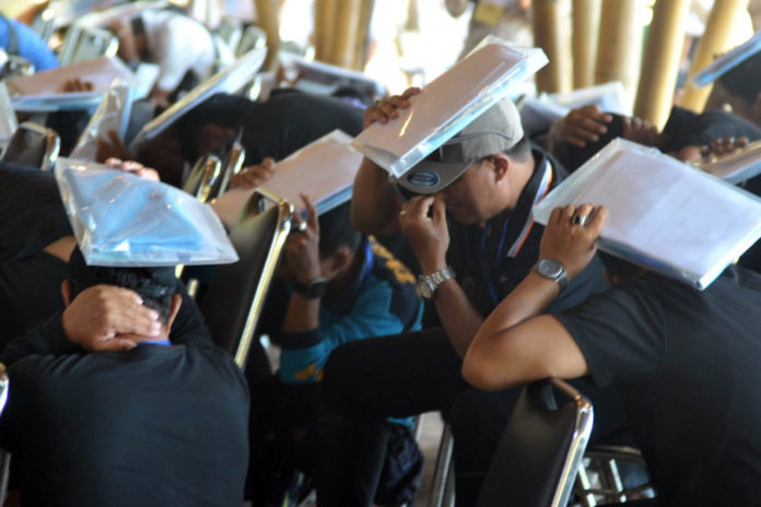 Sejumlah peserta Sekolah Lapang Gempa Bumi dan Tsunami mengikuti simulasi dalam menghadapi gempa bumi di Muntig Siokan Mertasari, Denpasar, Selasa (7/10). Kegiatan yang ini sebagai upaya untuk mewujudkan masyarakat siaga bencana gempa bumi dan tsunami.(BP/eka)
