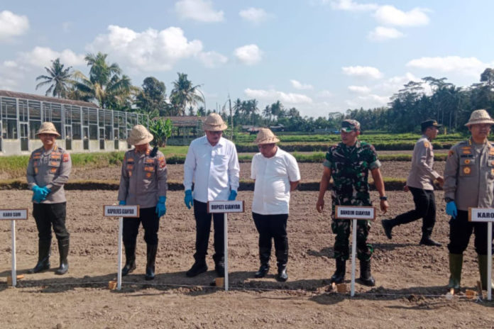 GIANYAR, BALIPOST.com – Untuk memperkuat ketahanan pangan nasional Kapolda Bali Irjen Pol Daniel Adityajaya, S.H., S.I.K., M.Si., didampingi Wakil Bupati Gianyar Anak Agung Gde Mayun, S.H., bersama Sekda Gianyar I Gusti Bagus Adi Widhya Utama melaksanakan kegiatan tanam jagung serentak Kwartal IV Tahun 2025 di Subak Belong, Banjar Tarukan Kaja, Desa Pejeng Kaja, Kecamatan Tampaksiring, Rabu (8/10).