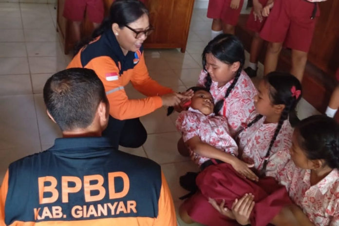 “Anak-anak diberikan pemahaman dan pelatihan sejak dini, melalui simulasi seperti ini, mereka bisa tahu apa yang harus dilakukan ketika bencana benar-benar terjadi,” ucap Dewa Gede Kusuma Yuda.