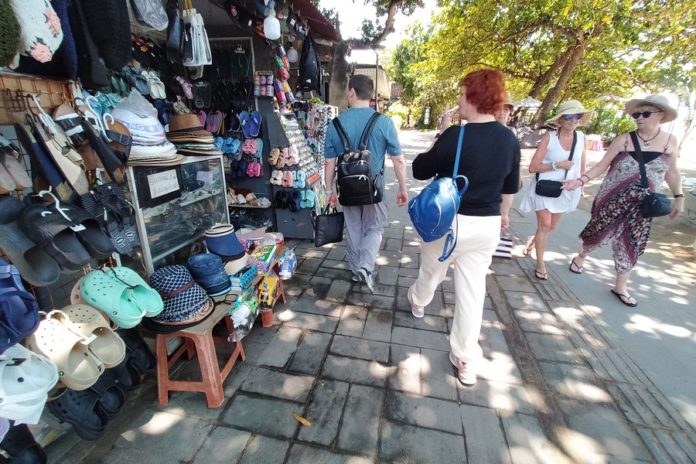 Beberapa wisatawan mancanegara (wisman) melihat produk Usaha, Mikro, Kecil, dan Menengah (UMKM) yang terpajang di salah satu pedagang tepi Pantai Sindhu, Denpasar. (BP/eka)