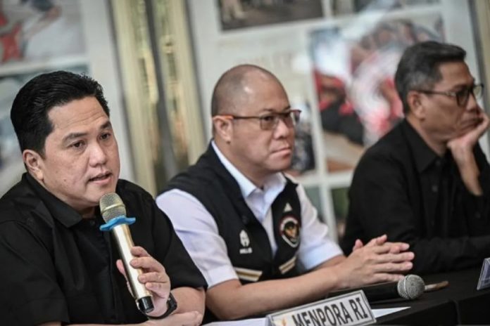 Menteri Pemuda dan Olahraga Erick Thohir (kiri), Chef de Mission (CdM) Kontingen Indonesia untuk SEA Games 2025 Bayu Priawan Djokosoetono (kedua kanan), dan Sekretaris Jenderal Komite Olimpiade Indonesia (KOI) Wijaya Mithuna Noeradi (kanan) menyampaikan keterangan pada konferensi pers di Kantor Kemenpora, Jakarta, Jumat (21/11). (BP/Antara)