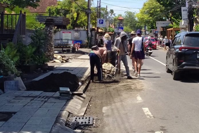 Pekerja sedang menyelesaikan penataan trotoar dan penanaman kabel bawah tanah di kawasan Sanur, Denpasar. Pengerjaan SJUT ini mengalami beberapa kendala. (BP/eka)