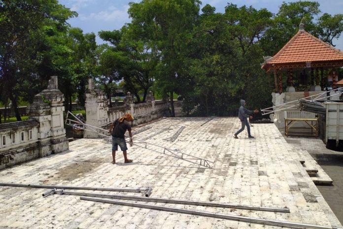 Pekerja sedang merakit tenda saat persiapan pujawali di Pura Sakenan Serangan, Denpasar, Rabu (26/11). Pujawali di pura ini akan dilaksanakan pada Sabtu (29/11) yang bertepatan dengan Hari Raya Kuningan. (BP/eka)
