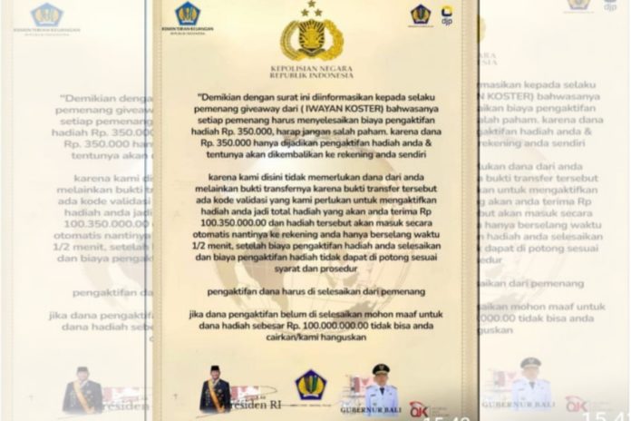 “Gubernur Bali tidak pernah mengadakan giveaway berhadiah uang. Jika ada pihak yang meminta pembayaran dengan alasan pengaktifan hadiah, itu dipastikan penipuan. Kami mohon masyarakat segera mengabaikan dan melaporkan nomor tersebut,” katanya.