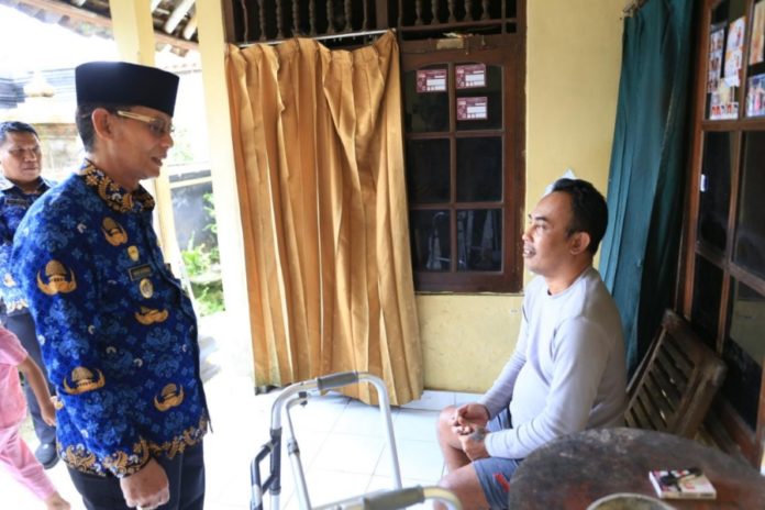 SEMARAPURA, BALIPOST.com – Tetap semangat jangan berkecil hati dan semoga selalu diberikan kesehatan. Motivasi tersebut diberikan Bupati Klungkung, I Made Satria saat menyalurkan bantuan paket sembako kepada penyandang disabilitas I Putu Budiarta (29) di Dusun Sangging, Desa Akah, Kecamatan Klungkung, Senin (1/12).