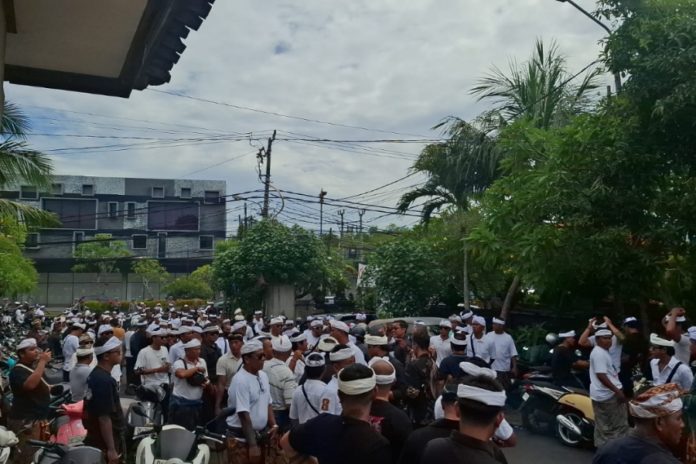 Ribuan warga Jimbaran mendatangi Polsek Kuta Selatan pada Selasa (2/12). Mereka menuntut agar dua warganya dibebaskan dalam kasus sopir ngamuk di Jimbaran. (BP/kmb)