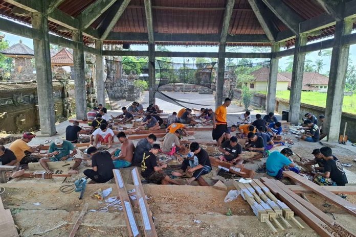 Sementara pengerjaannya secara  gotong royong “tedun”  banjar dari Banjar Melayang, Banjar Siih, Br.Tengah, Banjar Pande, Banjar Pande, Banjar Sema serta Tempekan Mulung dan total 335 KK. Ditambahkan di Pura Dalem sedang dalam proses perbaikan, Pelinggih Pesamuan.Dalam proses gedong penyimpenan Ratu Gede, Ratu istri dan sisya. (Agung Yuliantara/denpost)
