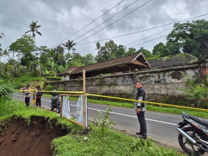 BANGLI, BALIPOST.com – Bahu jalan sepanjang 12 meter di Banjar Kembang Merta, Desa Penglumbaran, Susut mengalami amblas. Untuk mengantisipasi hal yang tidak diinginkan pihak berwenang telah memasangi police line di sekitar lokasi kerusakan.