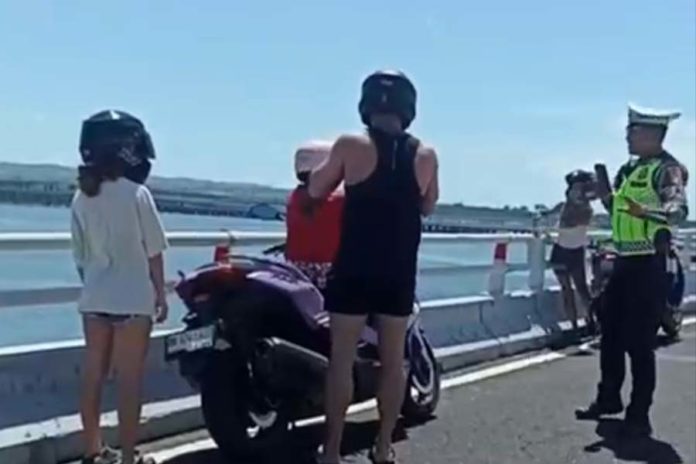 Petugas menegur WNA yang berhenti di jalur sepeda motor Jalan Tol Bali Mandara, Denpasar Selatan. (BP/Istimewa)