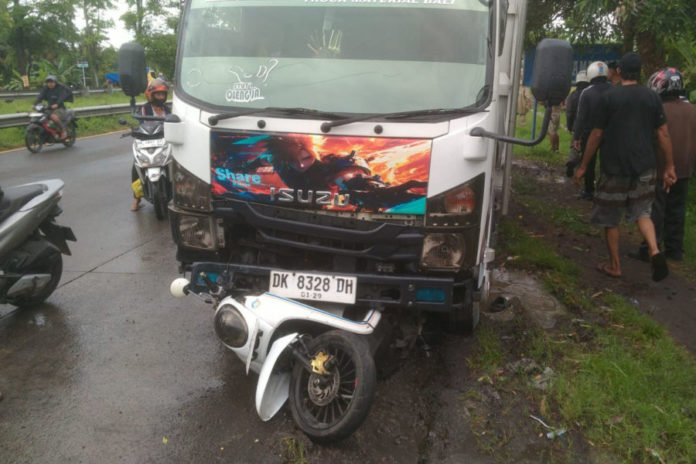 Truk dan sepeda motor yang terlibat lakalantas di Jalan Bypass Prof. Ida Bagus Mantra, kawasan Desa Lebih, Senin (8/12). (BP/istimewa)