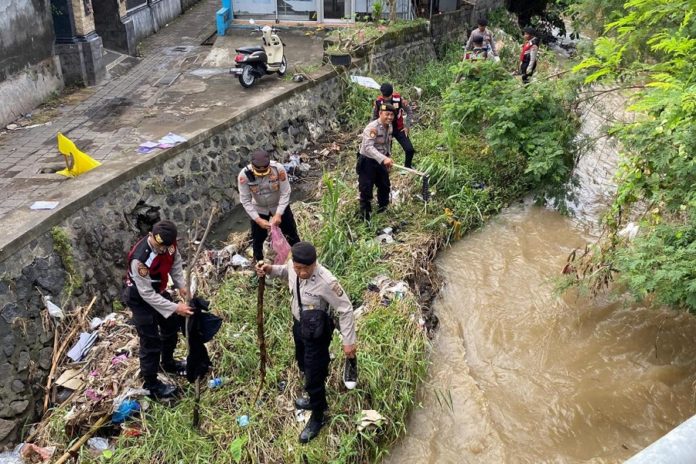 Personel Polres Klungkung turun membersihkan sampah yang menyumbat aliran sungai Candigara, Desa Kusamba, Kecamatan Dawan belum lama ini. (BP/Istimewa)