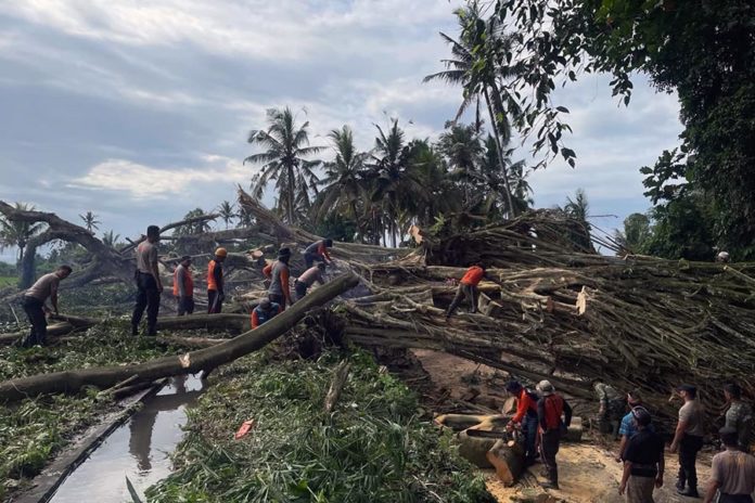 Untuk mempercepat penanganan sekaligus mencegah kemacetan dan potensi kecelakaan, petugas gabungan segera melakukan pemotongan serta pembersihan material pohon dari badan jalan.