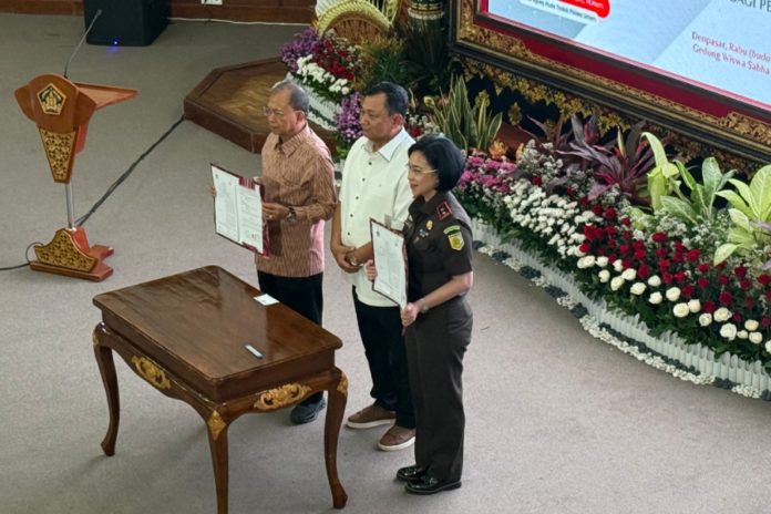 DENPASAR, BALIPOST.com – Kejaksaan Tinggi (Kejati) Bali melakukan penandatangan Memorandum of Understanding/Perjanjian Kerja Sama (MoU/PKS) dengan Pemerintah Provinsi Bali tentang Pelaksanaan Pidana Kerja Sosial Bagi Pelaku Pidana, di Gedung Wiswa Sabha Utama, Kantor Gubernur Bali, Rabu (17/12). Penandatanganan disaksikan langsung oleh Sekretaris Jaksa Agung Muda Tindak Pidana Umum, Dr. Undang Mugopal, S.H., M.Hum. Acara juga dihadiri seluruh bupati/walikota se-Bali dan Kejati se-Bali.