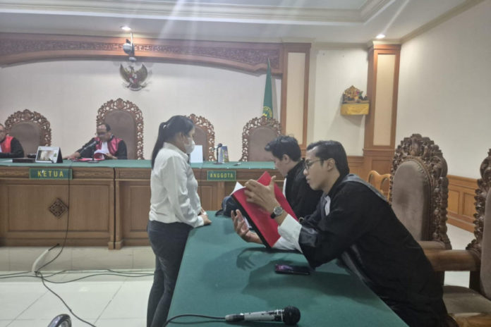 Terdakwa berdiskusi dengan kuasa hukumnya usai sidang tuntutan di Pengadilan Tipikor Denpasar. (BP/istimewa)