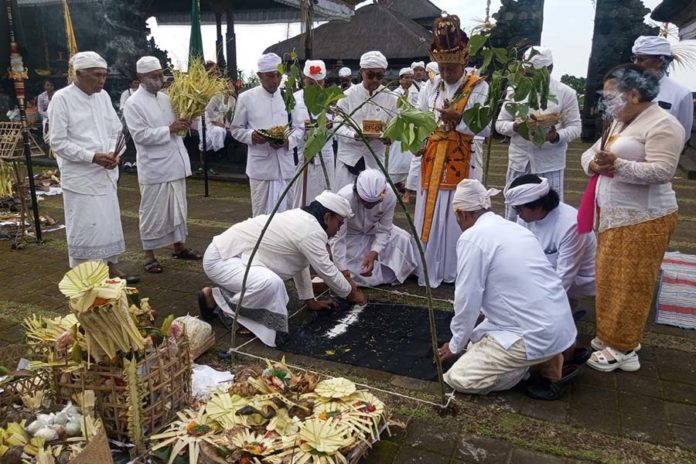 AMLAPURA, BALIPOST.com – Prosesi upacara Yasa Kerti Bumi Sudha dilaksanakan di Pura Pengubengan Besakih, Desa Besakih, Kecamatan Rendang, bertepatan dengan Sukra Kliwon Pujut, Tilem Sasih Kanem, Jumat (19/12). Upacara tersebut dipuput dua orang sulinggih.