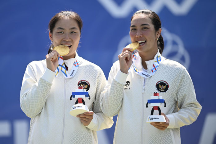 Petenis ganda putri Indonesia Janice Tjen (kiri) dan Aldila Sutjiadi (kanan) berpose dengan medali emasnya usai upacara penghargaan pemenang (UPP) final tenis ganda putri SEA Games 2025 di National Tennis Development Center, Pak Kret, Nothanburi, Bangkok, Thailand, Jumat (19/12/2025). (BP/Antara)