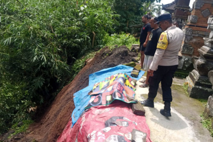 GIANYAR, BALIPOST.com – Cuaca ekstrem berupa hujan dengan intensitas tinggi yang melanda wilayah Kabupaten Gianyar memicu terjadinya bencana alam. Sebuah tembok penyengker tempat suci (merajan) milik warga di Banjar Pande, Desa Sumita, roboh akibat tanah longsor, Jumat (19/12).