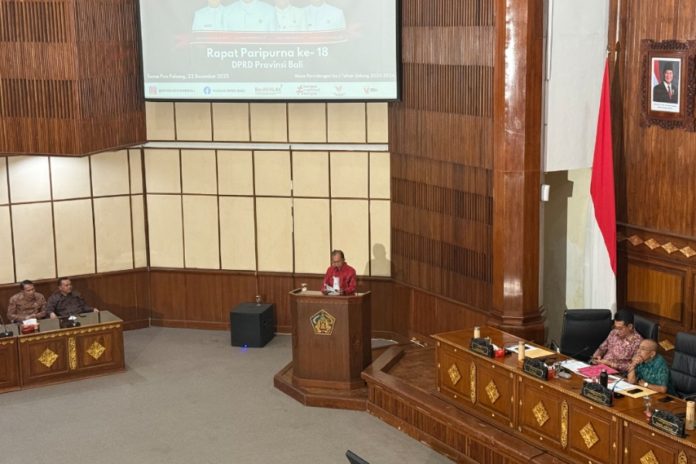 DENPASAR, BALIPOST.com – Gubernur Bali, Wayan Koster memberikan jawaban dan penjelasan atas Pandangan Umum Fraksi-fraksi DPRD Bali terhadap 5 Rancangan Peraturan Daerah (Ranperda) Provinsi Bali dalam Rapat Paripurna ke-18 DPRD Bali, di Gedung Wiswa Sabha Utama, Kantor Gubernur Bali, Senin (22/12).