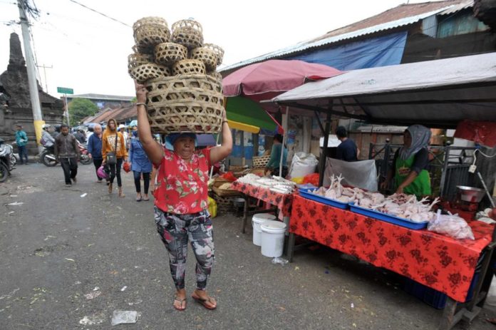 Aktivitas buruh angkut barang (tukang suun) di sekitar Pasar Kumbasari, Denpasar. Profesi tukang suun di pasar ini sebagian besar dilakoni kaum perempuan. (BP/eka)