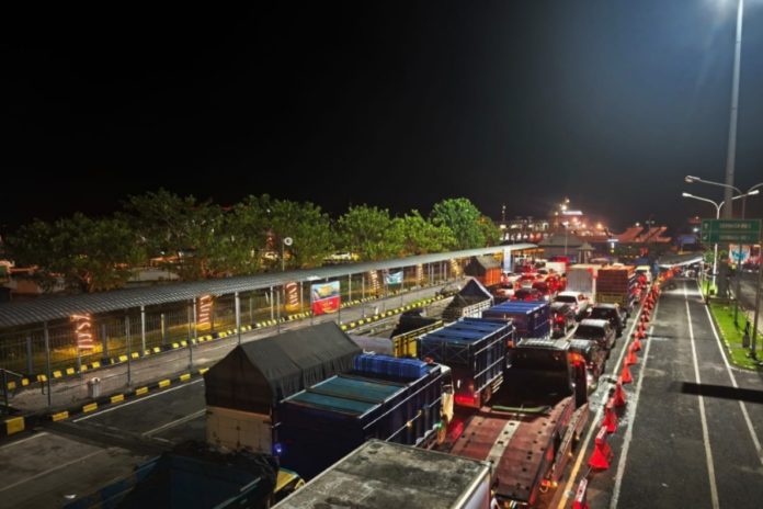 Kondisi di Pelabuhan Gilimanuk, Rabu (24/12) malam. Arus kendaraan yang hendak keluar Bali terlihat padat. (BP/istimewa)