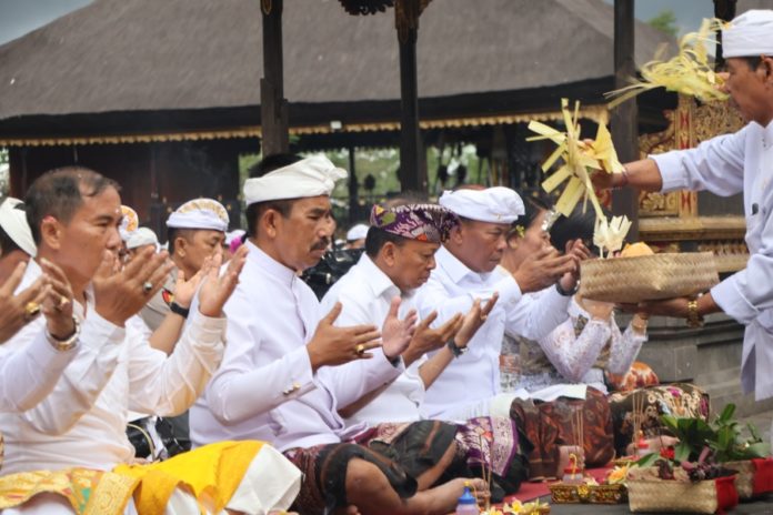 AMLAPURA, BALIPOST.com – Gubernur Bali, Wayan Koster menghadiri persembahyangan bersama sekaligus prosesi Matur Piuning sebagai penanda diresmikannya pelaksanaan Haluan Pembangunan Bali 100 Tahun 2025–2125 yang berlangsung di Pura Agung Besakih, Kecamatan Rendang, Kabupaten Karangasem, Rabu (24/12) pagi.