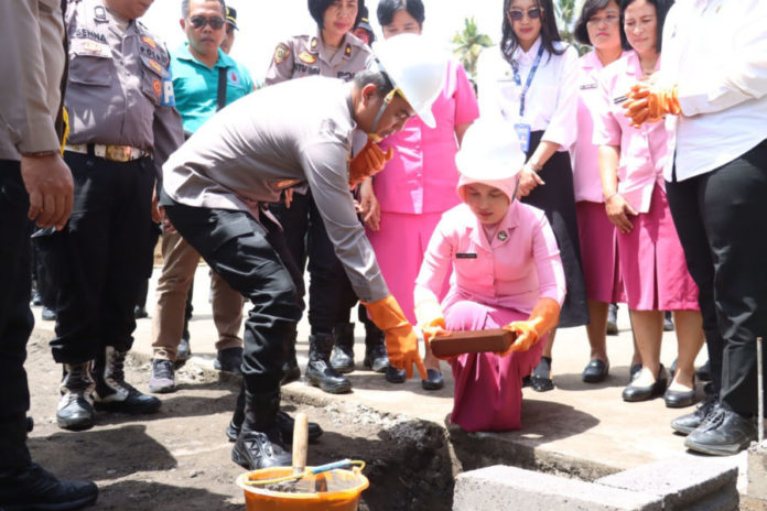 Kapolres Gianyar didampingi Ketua Yayasan Kemala Bhayangkari Cabang Gianyar, Ny. Ajeng Chandra mengikuti prosesi rangkaian pembangunan SPPG di Desa Sanding.(BP/istimewa)