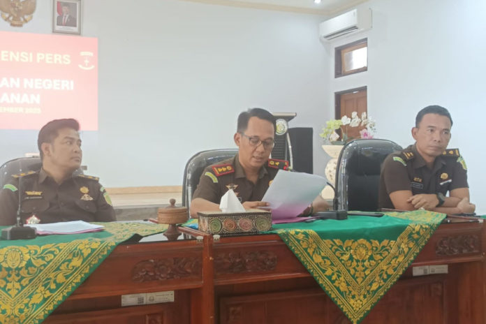 Kepala Kejaksaan Negeri Tabanan, Dr. Arjuna Meghanada Wiritanaya, S.H., M.H., (tengah, red) saat memberikan keterangan terkait jumlah penanganan perkara sepanjang 2025.(BP/bit)