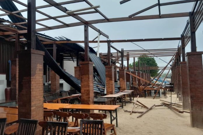 MANGUPURA, BALIPOST.com – Sejumlah kafe di Jalan Pantai Jimbaran, Kecamatan Kuta Selatan (Kutsel), Badung, rusak akibat diterjang angin kencang, pada Kamis (8/1). Terkait peristiwa ini, anggota Polsek Kutsel mendatangi lokasi dan mengimbau masyarakat selalu waspada.
