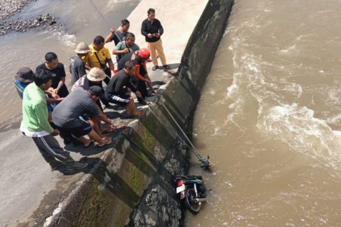 SEMARAPURA, BALIPOST.com – Nasib nahas dialami I Nengah Suda (61) saat melintas di Jembatan Sungai Unda, Desa Tangkas, Klungkung, Sabtu (10/1). Suda dan kedua cucunya jatuh ke sungai setelah tali gas motor yang dikendarai putus.