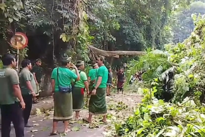 Di bawah arahan Pawas Aiptu Sang Kompyang Juliawan, petugas Monkey Forest dibantu Personel Polsek Ubud bergerak cepat memotong batang pohon menggunakan mesin sensor (chainsaw). Hanya dalam waktu 15 menit, material pohon berhasil disingkirkan dari badan jalan.