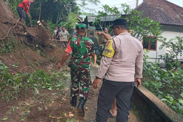 Masyarakat Banjar Mantring guna membersihkan material longsor.