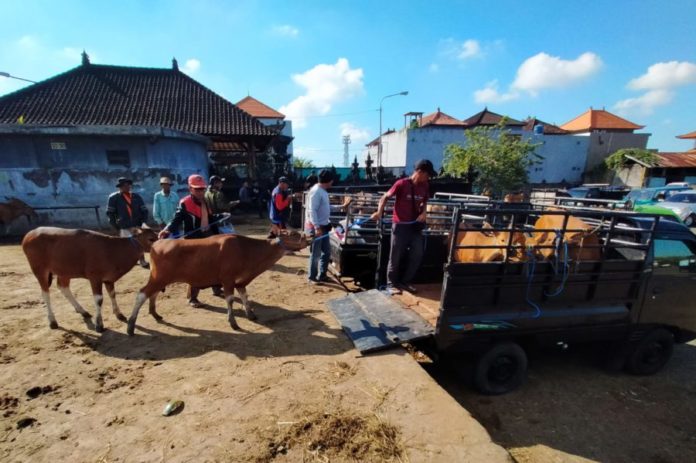 Seorang warga menarik sapi ke atas mobil pengangkut di Pasar Hewan Beringkit, Badung. (BP/eka)