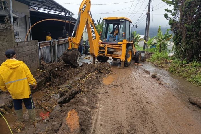 Sejumlah alat berat dan petugas langsung dikerahkan untuk mempercepat pembersihan material banjir yang menutup saluran dan badan jalan.