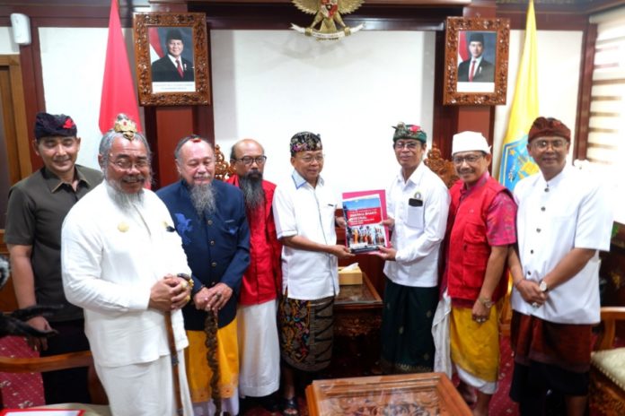 Wakil Ketua Umum Panitia Dharma Santi Nasional Nyepi Tahun Baru Caka 1948, I Nyoman Kenak, S.H., (kanan) didampingi anggota panitia yang lain, menyerahkan proposal kegiatan serangkaian Dharma Santi Nasional 2026 ke Gubernur Bali Wayan Koster, di Denpasar pada Kamis (15/1/2026). (BP/Istimewa)