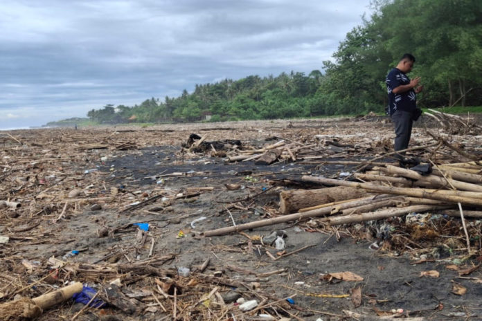 Tumpukan sampah didominasi kayu dan bambu. Hamparan pasir hitam yang menjadi ciri khas pantai nyaris tertutup material kiriman, membuat kawasan tampak kumuh dan tak nyaman untuk beraktivitas.
