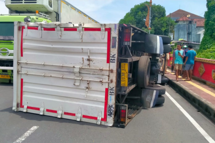 Truk boks terguling di Jalan Gatot Subroto Timur, Desa Kesiman Kertalangu, Dentim, setelah senggolan dengan kendaraan arah berlawanan.(BP/istimewa)