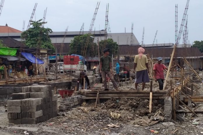 Pekerja sedang membangun kios-kios di Pasar Anyar Sari, Denpasar. Revitalisasi lanjutan pasar ini menggunakan pola swadaya. (BP/eka)