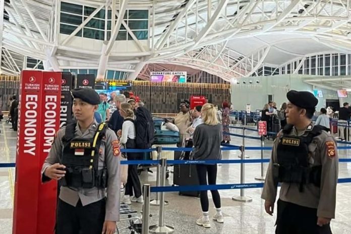 Personel Polres Bandara Ngurah Rai melaksanakan pengamanan di terminal internasional. (BP/istimewa)